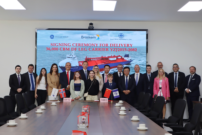 7月9日,Ocean Yield COO Andreas Reklev先生及我集團副總經理兼揚子三井總經理宋書明先生代表雙方簽署交船文件。