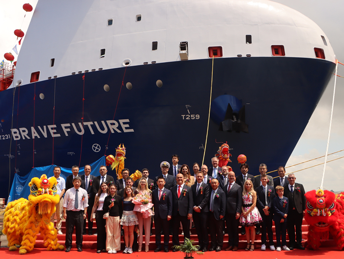 揚子三井代表宋書明先生表示:“繼今年1“Brilliant Future”號成功交付后,我們迎來了第二艘雙燃料LEG運輸船的交付。值此機會,我們衷心感謝BraskemCristiane女士、Hardi先生,以及Ocean YieldAndreas先生。感謝Hartmann集團的Hartmann博士、Adami船長、Ionut Cornea先生、龍葉飛先生,感謝AC-INOXSascha先生。感謝整個Hartmann團隊始終如一的支持,也感謝DNV船級的專業(yè)指導。同時,向所有參與本船建造的YAMIC員工致以誠摯謝意。未來,我們將繼續(xù)與各方緊密合作,為船東研發(fā)建造更加安全、更加綠色、更高性能的綠色能源氣體運輸船產品。”教母Cristiane Rego女士為新船命名并擲香檳禮,現(xiàn)場鞭炮齊鳴、禮花綻放,汽笛共鳴,龍獅共舞,祝福新船和船員航行平安,勇敢前行,為船東和租家?guī)砗眠\與財富,也為HartmannDNV和揚子三井贏得榮耀,帶給所有人勇氣與希望。Hartmann代表Adami Ulrich表示:“衷心感謝揚子三井團隊。揚子三井憑借嚴謹?shù)墓芾砗椭苊艿挠媱?,確保了本船的順利交付。我們對揚子三井未來的發(fā)展充滿信心,也感謝所有為此付出努力的員工?!?/span>Braskem代表Hardi Schuck表示:“正是由于揚子三井在船舶建造過程中的專業(yè)精神與奉獻,讓我們對Brave Future感到無比自豪?!?/span>