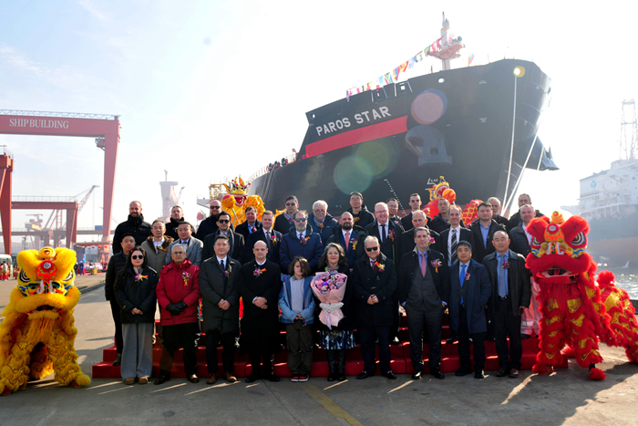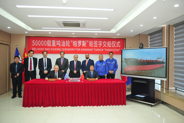 1月9日,在各方代表的共同見證下,船東公司代表Spyridon Papandreou先生與我集團(tuán)副總經(jīng)理兼新?lián)P子造船總經(jīng)理杜成忠先生分別代表雙方簽署“PAROS STAR”輪交船文件。