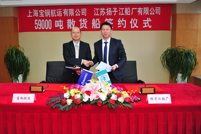 ▲11月13日下午,我集團(tuán)下屬江蘇揚子江船廠有限公司與上海寶鋼航運有限公司簽署了2艘59000噸散貨船新造船合同。集團(tuán)董事長任樂天先生,寶鋼資源(國際)有限公司董事長張典波先生,寶鋼資源(國際)有限公司總裁陸克從先生,我集團(tuán)副總經(jīng)理宋書明先生,副總經(jīng)理杜成忠先生,以及來自寶鋼資源、寶武原料、寶鋼航運、中聯(lián)海運、上海船舶研究設(shè)計院、中國船級社等領(lǐng)導(dǎo)和重要嘉賓出席簽約儀式。