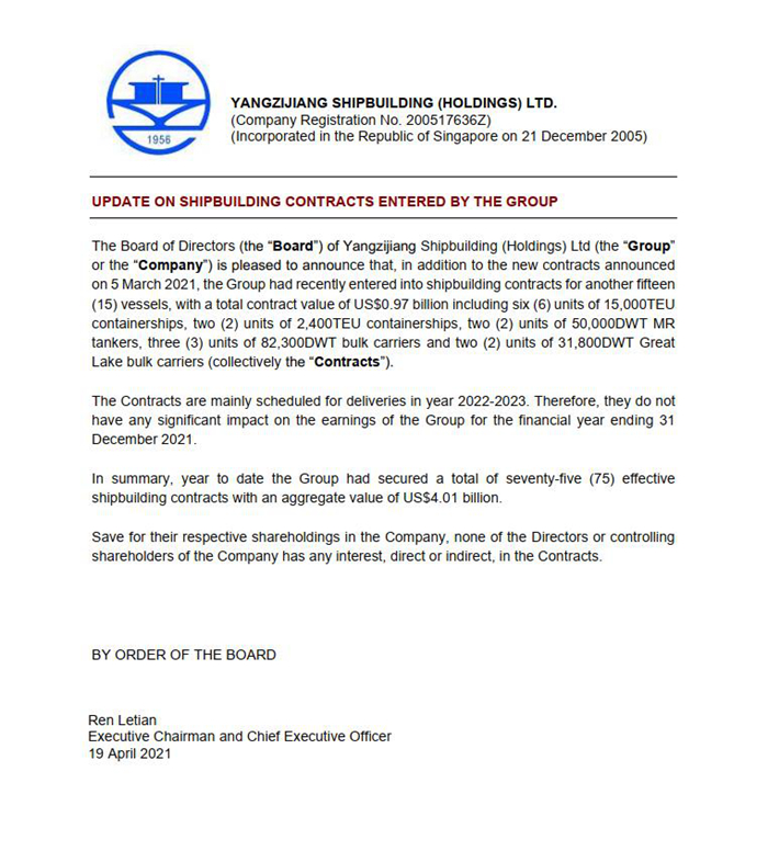 4月19日,上市公司發(fā)布公告,集團近簽署了15艘、總價值達9.7億美元的新船建造合同。15艘新造船舶包括: