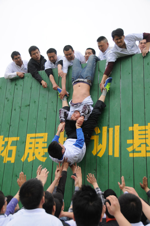 下午的拓展項(xiàng)目更是“體驗(yàn)升級(jí)”,“卓越圈”項(xiàng)目讓人意識(shí)到從優(yōu)秀到卓越不是一蹴而就的,是一個(gè)曲折的過程,是一個(gè)不斷超越的過程,在一輪一輪挑戰(zhàn)5.4秒這個(gè)終極時(shí)限的過程中,我們的年輕干部們磨傷了手、劃傷了臉、蹲酸了腿,任灰塵在身邊沸騰,任汗水在臉上流淌,他們都沒有退縮一步,不斷的嘗試、改進(jìn)、再嘗試、再改進(jìn),最終,5.21秒這個(gè)卓越的成績被記錄在了成績冊(cè)上,大家歡呼雀躍。到了最后的挑戰(zhàn)了,“畢業(yè)墻”垂直立于地面,沒有輔助設(shè)施,沒有輔助人員,大伙兒覺得需要1.5小時(shí)這47名學(xué)員才能全部翻過這面墻——4.2米高的墻。按照教練的指導(dǎo),做基礎(chǔ)的、做輔助的、做保護(hù)的、做拉手的,自發(fā)輪流上陣,伙伴們一個(gè)一個(gè)互相拉扯著翻越了畢業(yè)墻,他們中有人肩膀被踩破了,有的肌肉僵硬了,有的手臂勒紫了,但都沒有吭一聲,只想著讓所有的伙伴全都快速翻過墻,堅(jiān)持不懈的精神在他們中不斷傳遞著……終于他們創(chuàng)造了一個(gè)自己都沒敢想的奇跡,15分49秒51,所有47人全部完成了翻越!