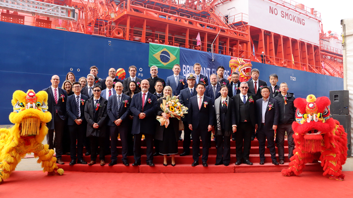 On the morning of January 14th, Yang-zi Mitsui Shipbuilding held a grand naming ceremony for the vessel. Ms. Silvia Pires Migueles, the godmother of the vessel, named the vessel and tossed champagne. The signing and delivery ceremony of "BRILLIANT FUTURE", the first dual-fuel LEG carrier built by Yang-zi Mitsui, was also completed on the same day of the naming ceremony.